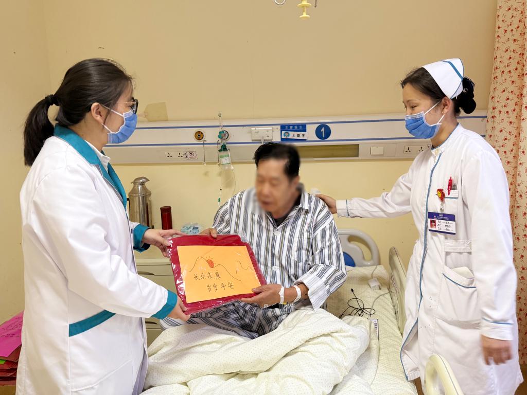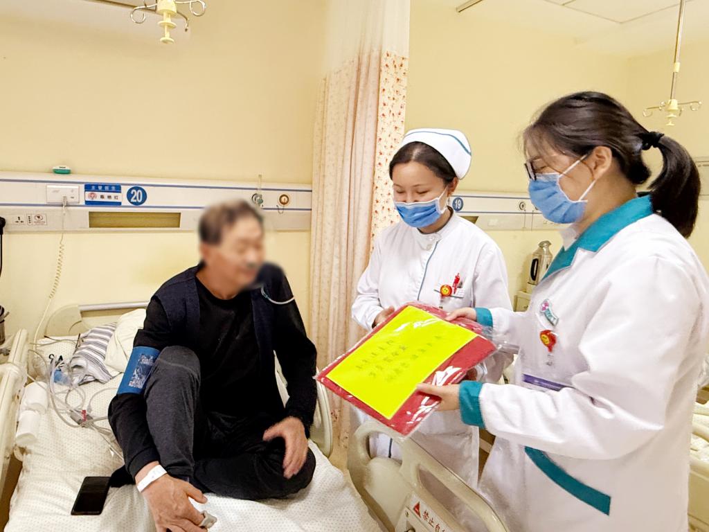 10月29日,神经内科病房洋溢温馨感人气氛。护士长潘彤带领医护团队与医务社工,来到老年患者床前,将这份特别礼物送到他们手中。