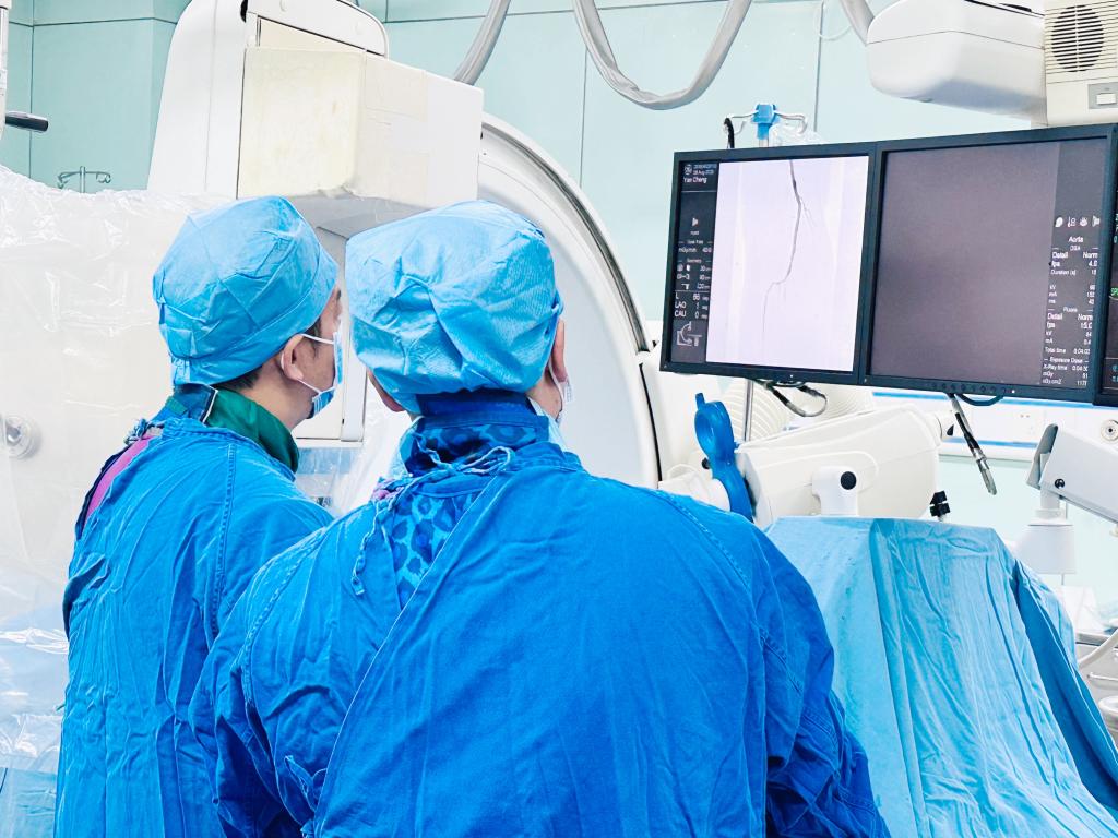 小肠出血定位困难,介入放射学成为破局关键。副主任医师陈力强、医师李宏伟和护士长李志斌在介入导管室开展急诊血管造影。