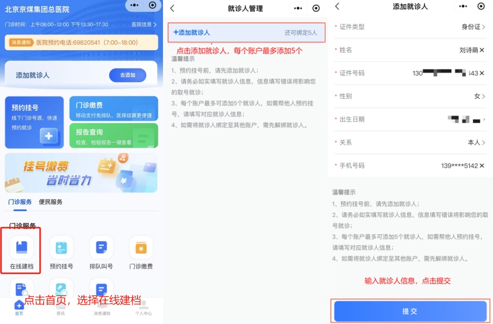 对于首次就诊的患者需要添加就诊人信息并在医院建档,点击首页中的在线建档,填写就诊人信息,每个账户最多添加5个就诊人。验证身份后,填写档案信息。