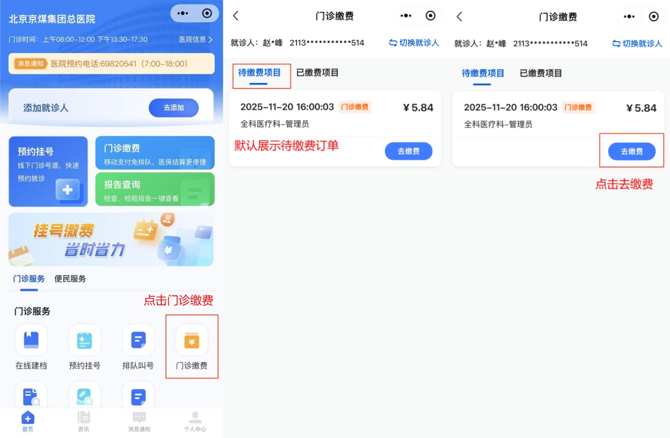 进入小程序首页,点击门诊缴费,默认选择待缴费项目展示待缴费列表,点击去缴费完成缴费。