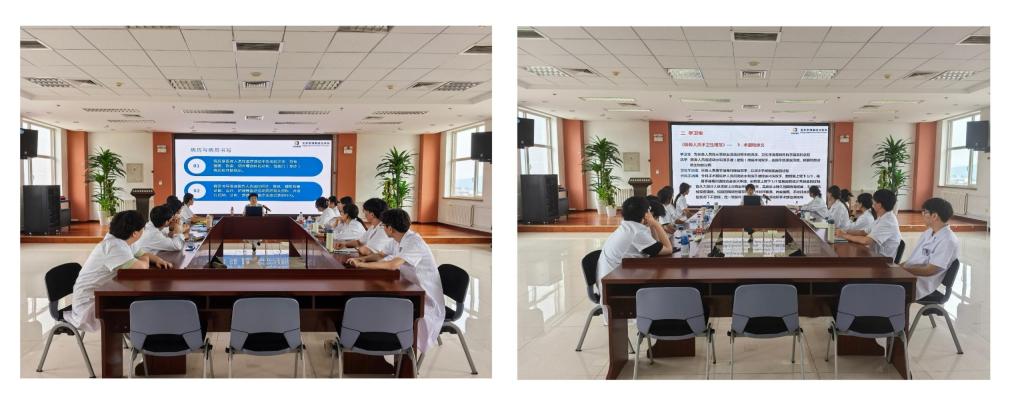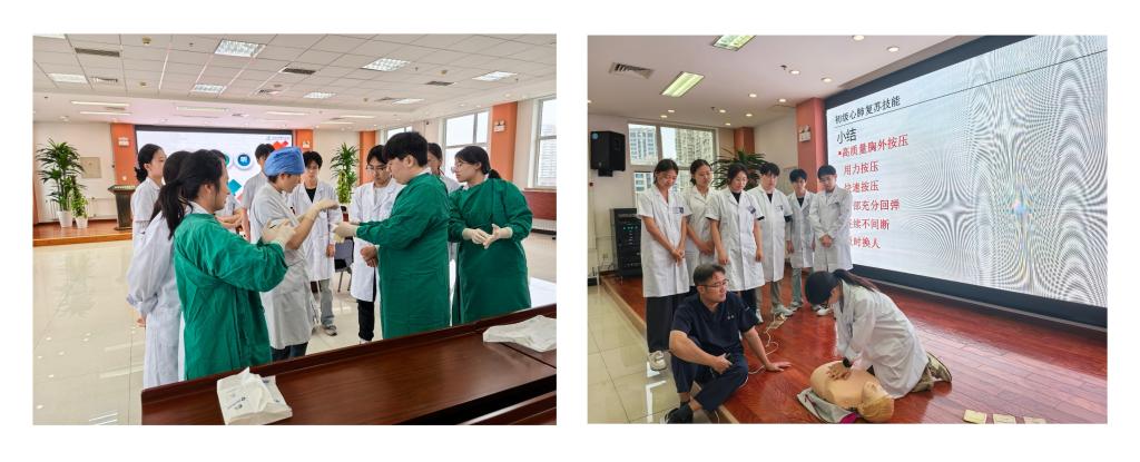 在临床技能方面,大内科王小荣主任结合临床真实案例,详细讲授了《病历书写基本规范》,帮助实习医师深刻理解病历书写不仅是临床思维的具象化体现,更是保障医疗安全、维护患者权益的重要环节。原院感科主任现医学工程科科长张文艳围绕医院感染预防与控制展开培训,重点讲解手卫生、防护用品使用等实操细节,突出院感防控在临床工作中的重要性。急诊科闫冰主任在理论授课的基础上,利用模拟人设备进行心肺复苏技能培训,通过一对一练习纠错,确保每位实习医师熟练掌握急救技能。手术室王娟弟护士长采用讲解、演示、练习一对一指导模式对无菌技术操作进行培训,帮助实习医师掌握无菌原则及操作要点,并带领实习医师进入手术室现场观摩学习。